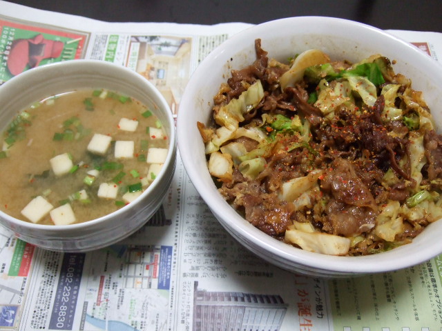 牛肉をサッと焼いてキャベツを1/4ほどザク切りにして