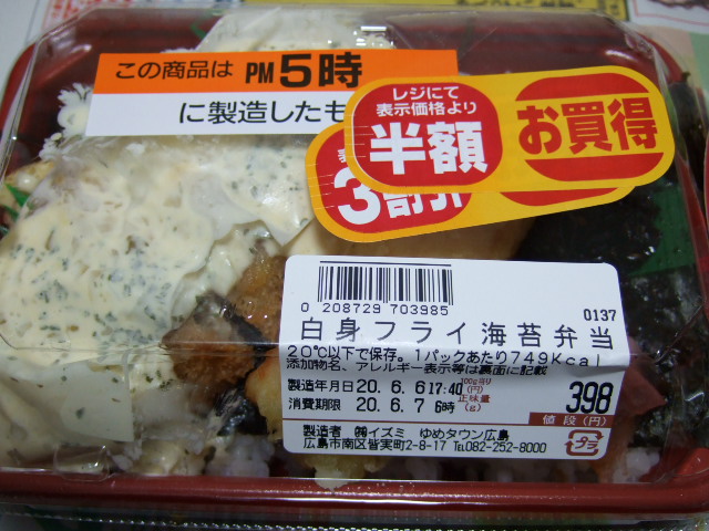 白身フライののり弁398円と