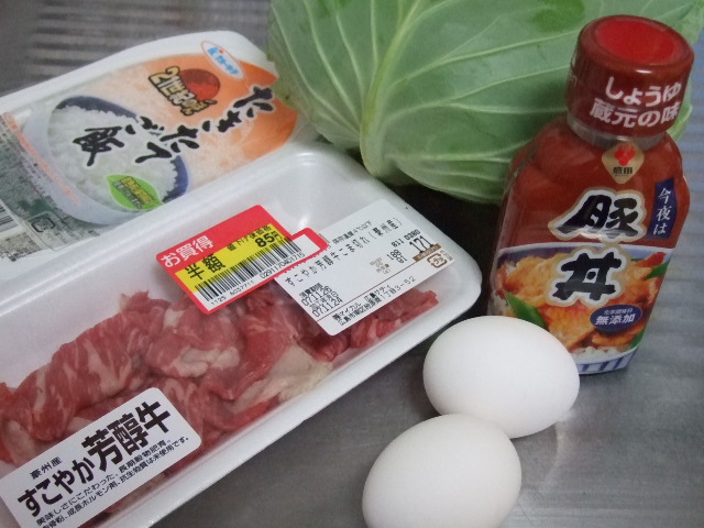 牛肉をサッと焼いてキャベツを1/4ほどザク切りにして
